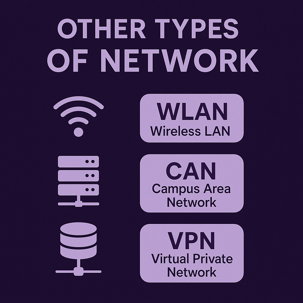 Apart from the common types like LAN, WAN, MAN, and PAN, there are some special-purpose networks used in specific environments. Let’s look at them briefly: